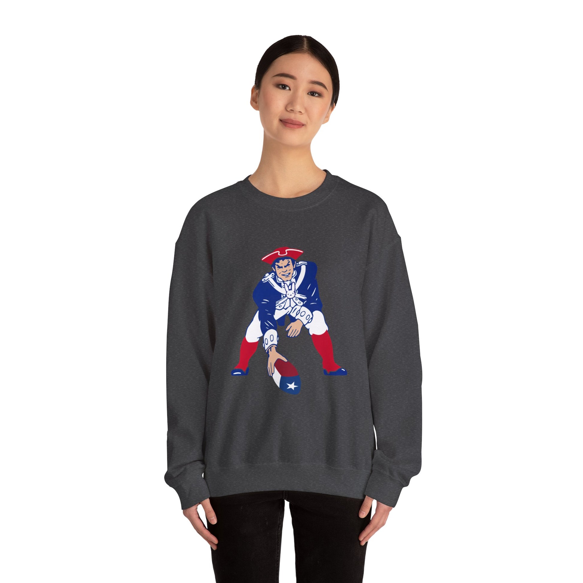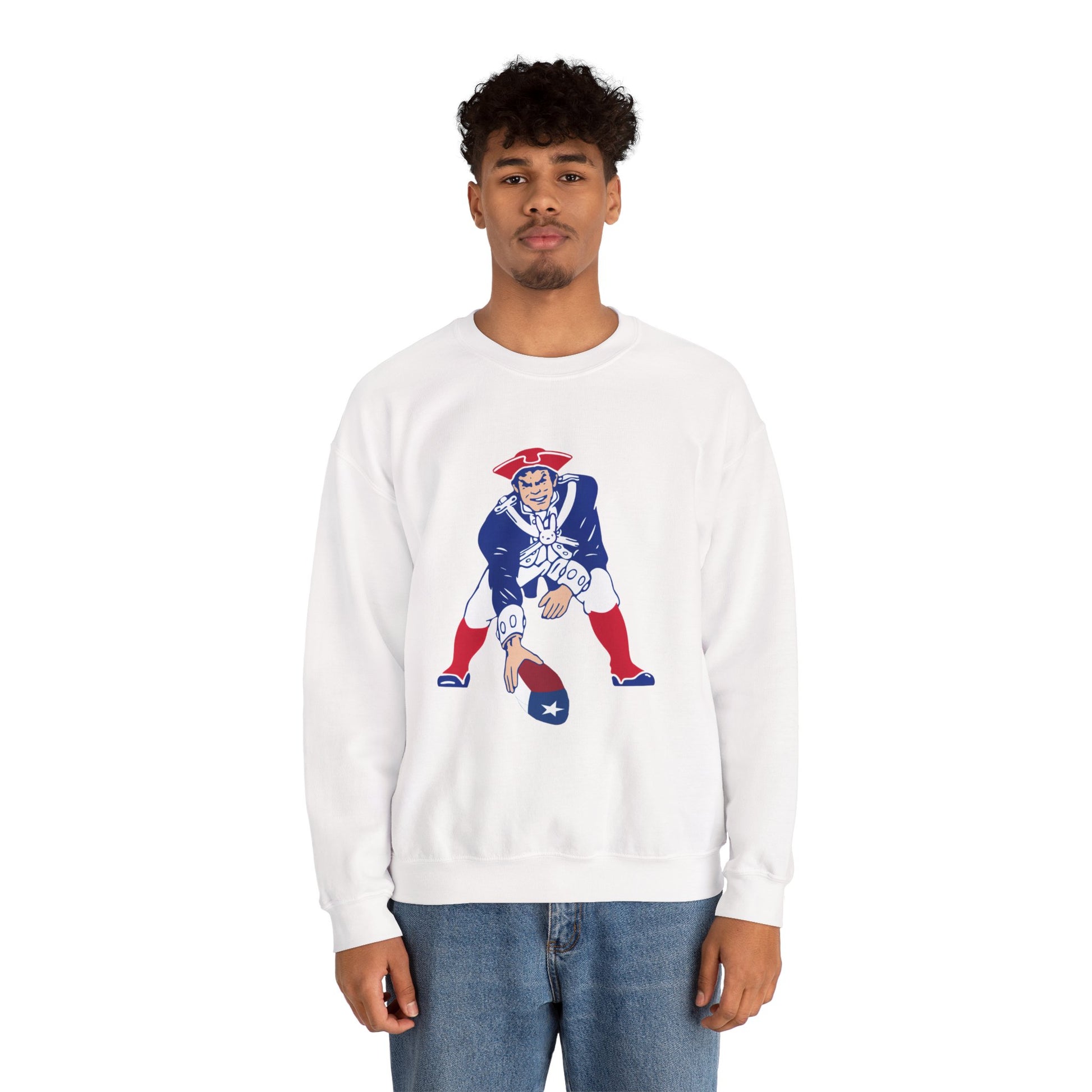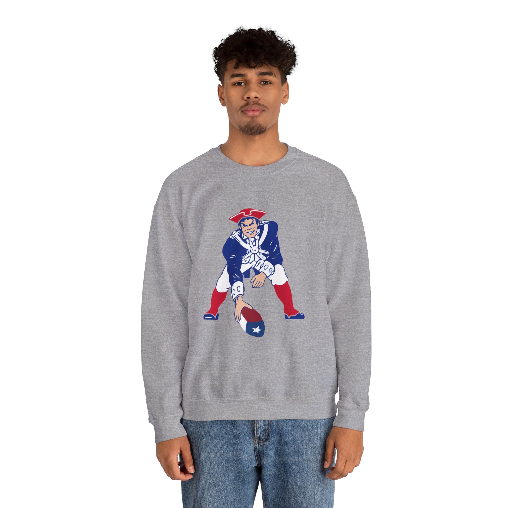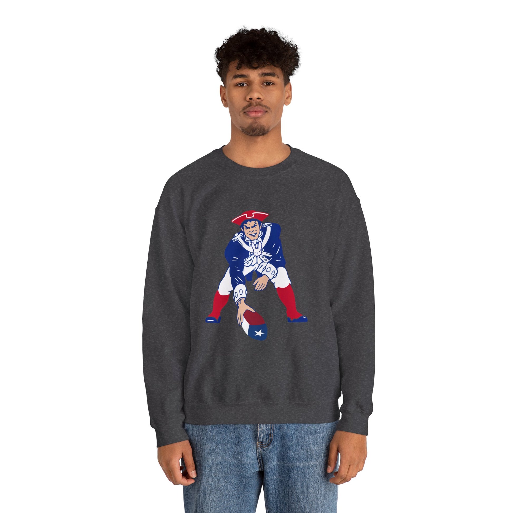 This midweight SCBC crewneck brings vintage Americana to everyday wear. The soft 50/50 cotton-poly blend sits just right — warm without being bulky — and the classic cut keeps the silhouette clean. A retro-styled patriot quarterback graphic sits on the chest, lending a playful, nostalgic edge that feels like a found favorite. Subtle details like ribbed collar and durable double-needle stitching mean this sweatshirt wears in, not out. It drapes easily over jeans or layered under a jacket for brisk mornings or late-night tailgates.