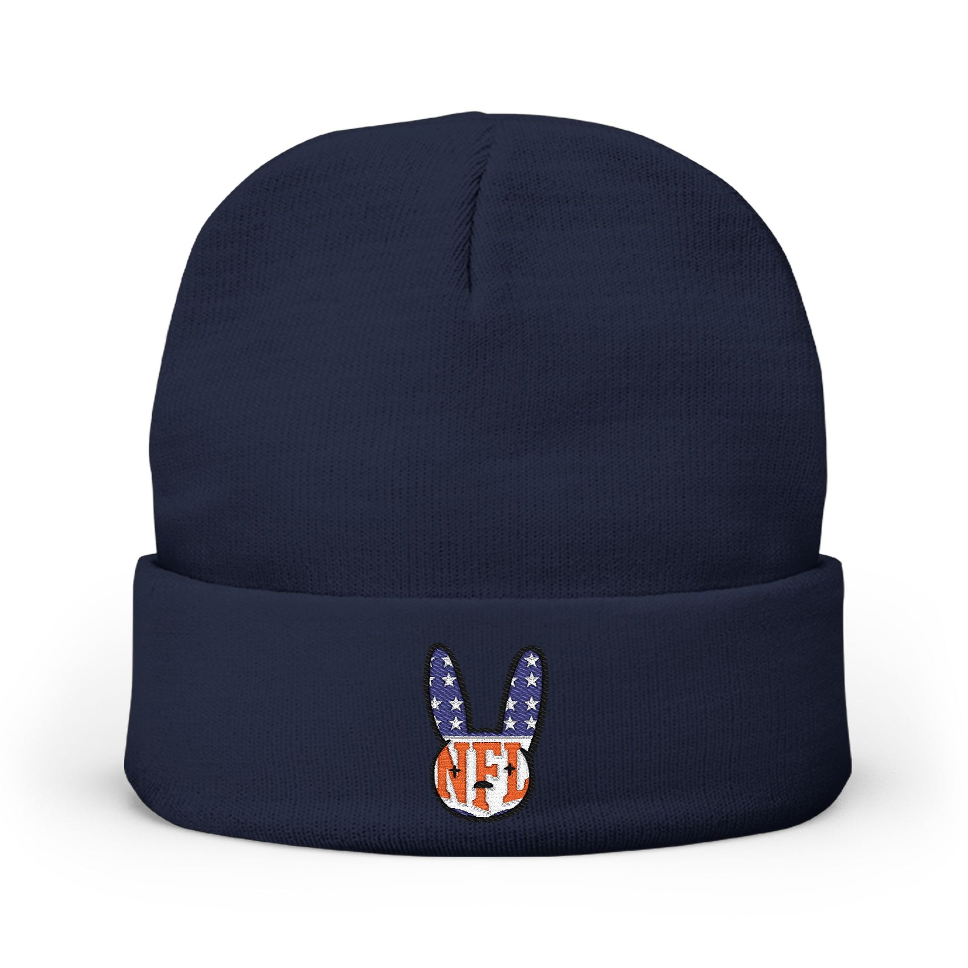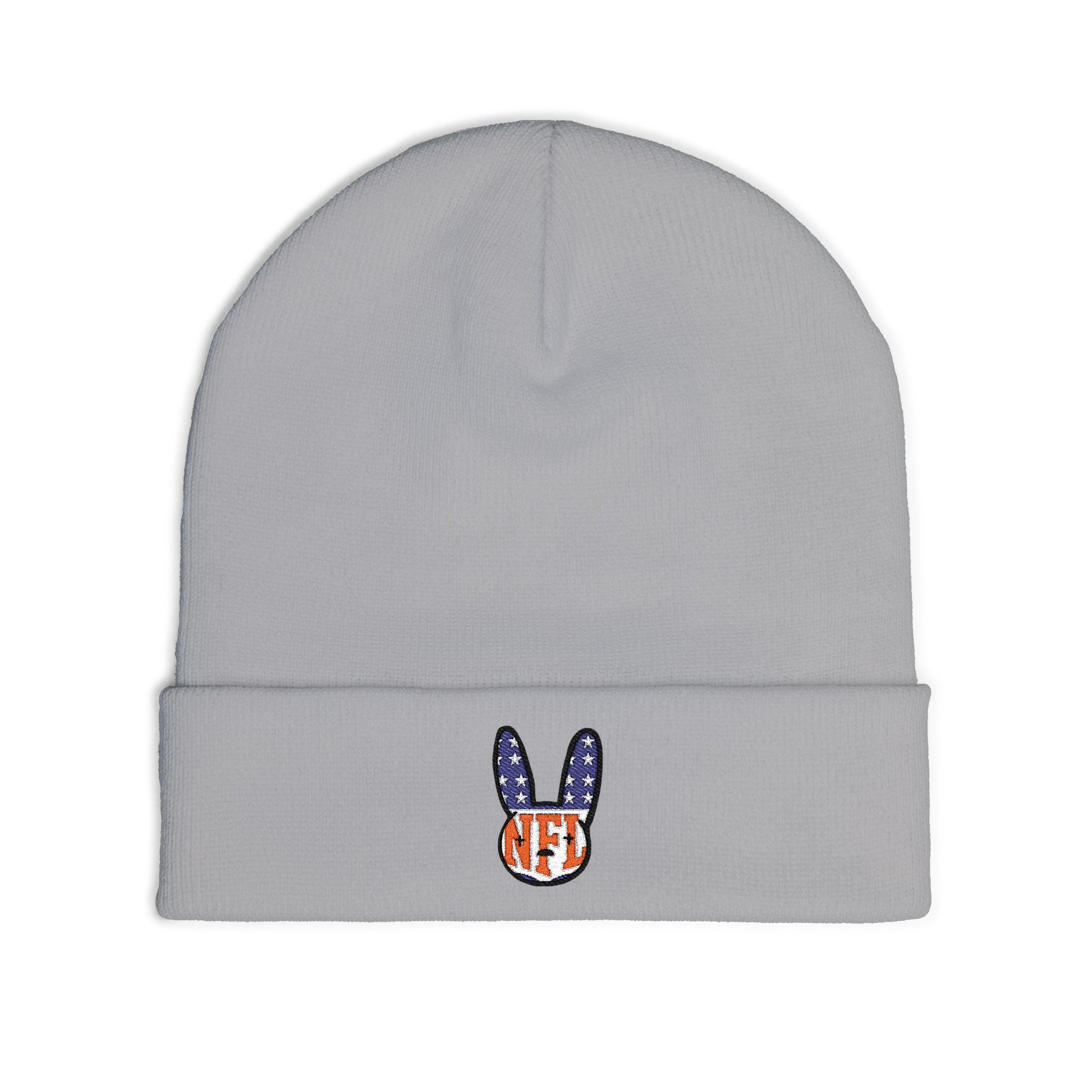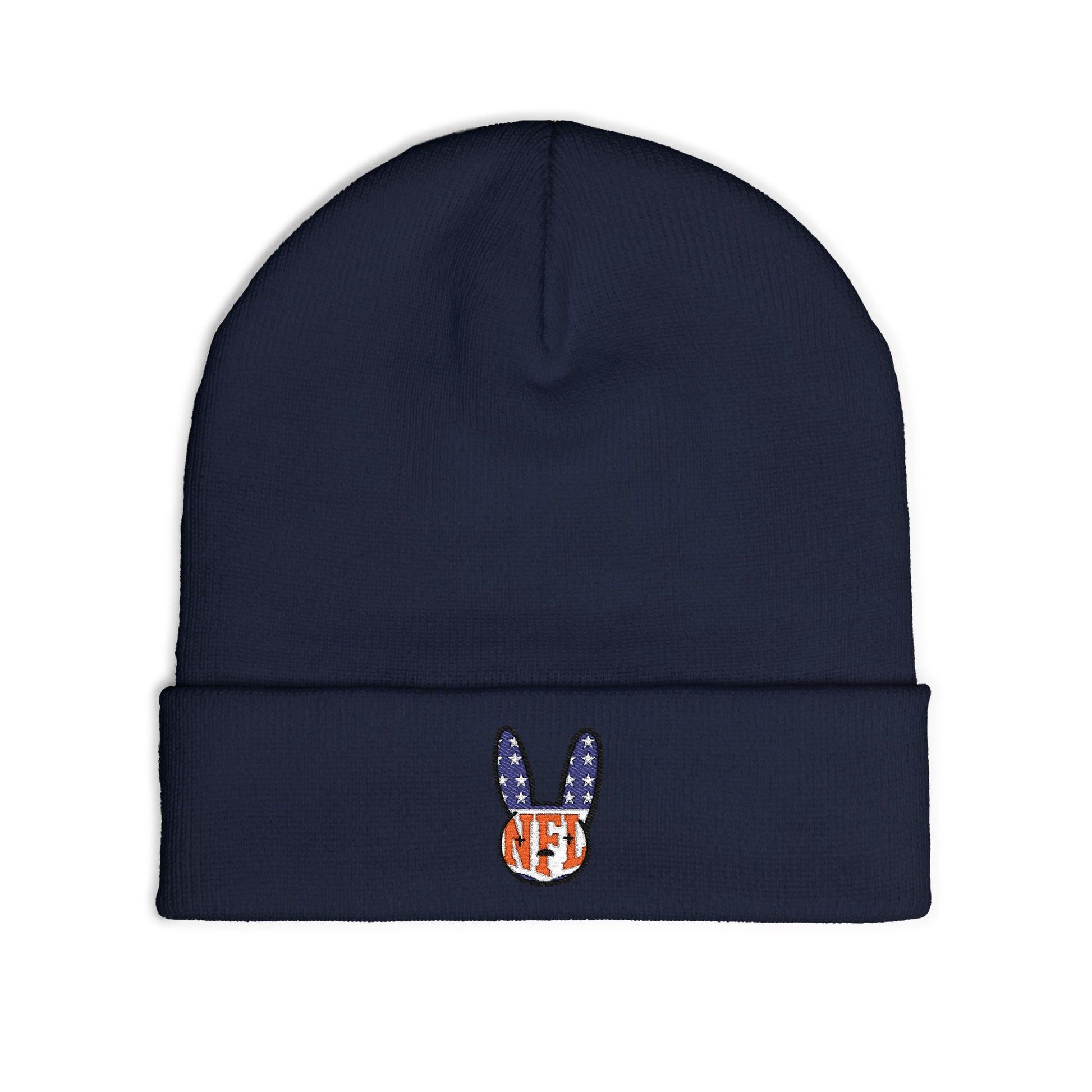 A soft, form-fitting knit SCBC beanie with a small embroidered emblem at the cuff — a playful peace-sign hand patterned in stars-and-stripes with a textured orange center. The lightweight cotton-acrylic blend breathes while still holding shape, so it layers easily under jackets or pairs with streetwear without bulk. Wear it folded low over your ears on chilly walks, or pushed back with hair loose for a casual, lived-in look. The understated embroidered detail adds personality without shouting, giving this beanie a quiet, Americana-tinged vibe that fits everyday errands, tailgates, and late-night coffee runs.