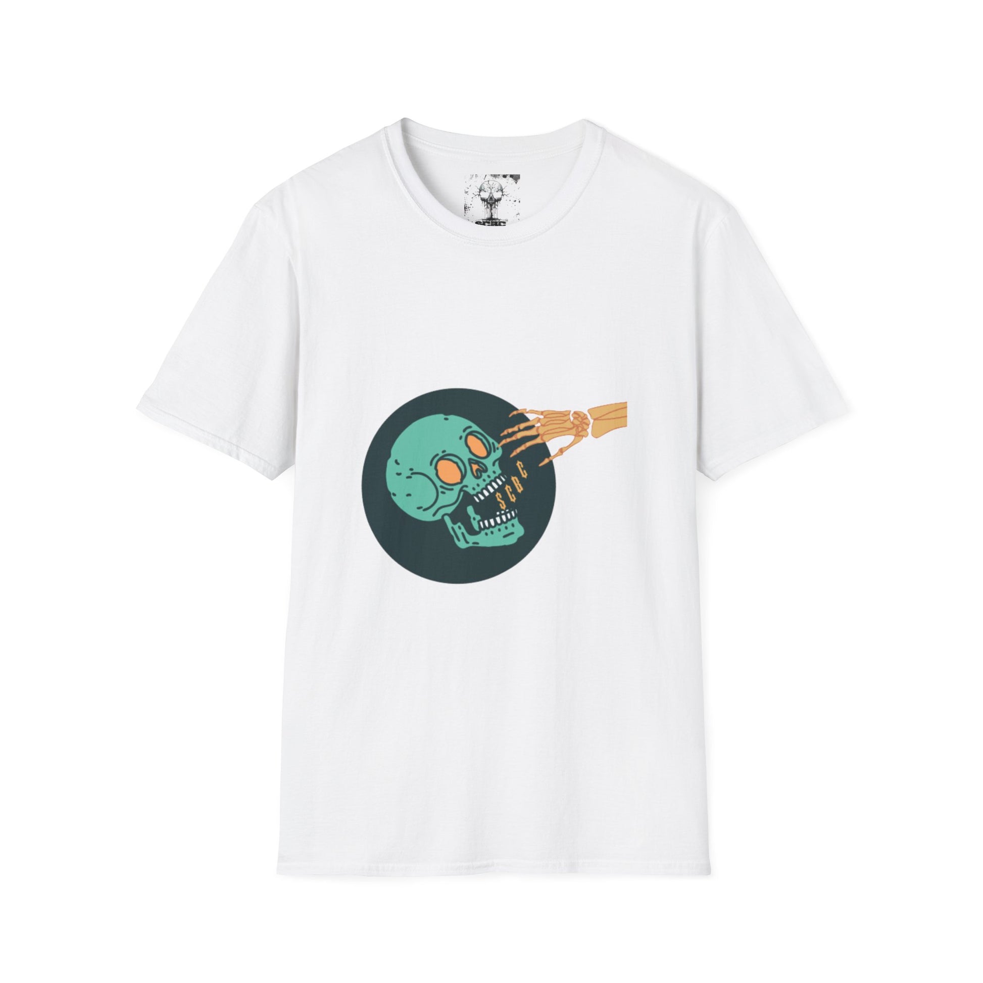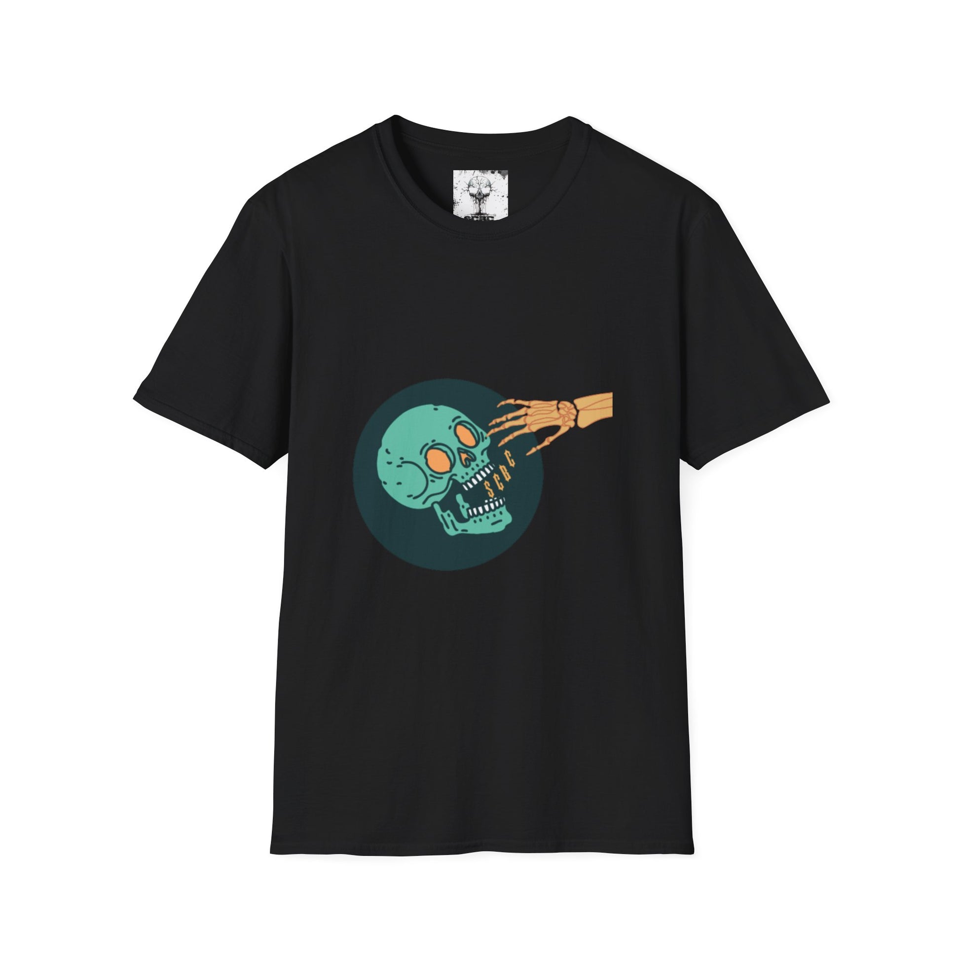 A lightweight, grown-up tee that carries a little edge. Soft ring-spun cotton drapes easily across the shoulders while a bold, retro skull graphic catches the eye—muted teal skull, warm orange hand and a deep circular vignette that feels equal parts vintage poster and underground zine. It’s the kind of shirt you pull on for late-night record hunts, alleyway murals, or coffee shop sketch sessions. The fit is classic and breathable, so the artwork sits flat and readable whether you’re layered under a jacket or standing alone. Wear it when you want your look to feel effortless but a little rebellious—an honest nod to nights spent making and discovering.